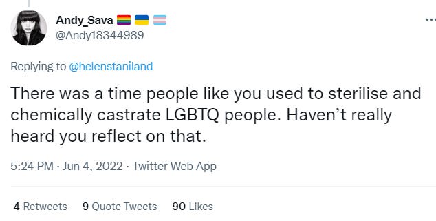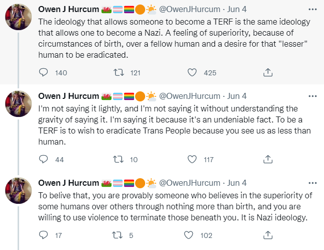 Trans activists have long smeared gender-critical women as ‘Nazis’—which has proved a convenient shorthand for “I’m not talking to you and nobody else should listen to a word you say, and—if someone punched your lights out—that would be a win for humanity.” But Corinna Cohn’s right to point out that there’s been an alarming escalation in trans activist rhetoric about Nazism, eugenics, euthanasia, and genocide over the last few months, spiking over the weekend with a wildly dishonest attack on two prominent gender-critical women.