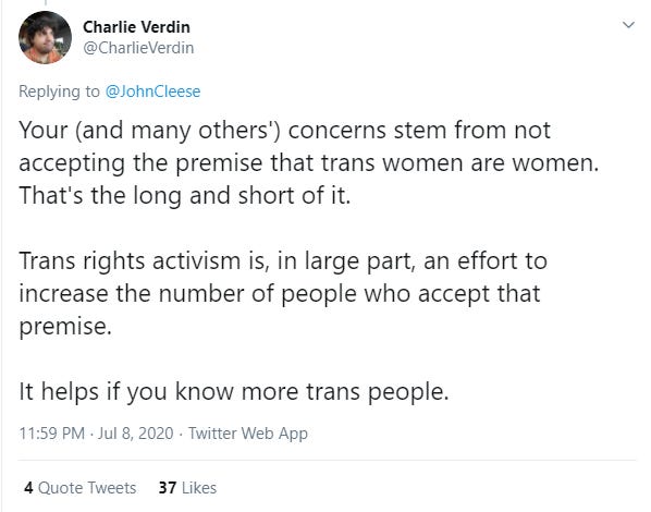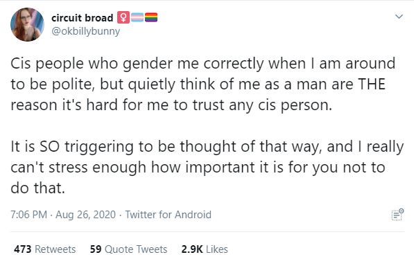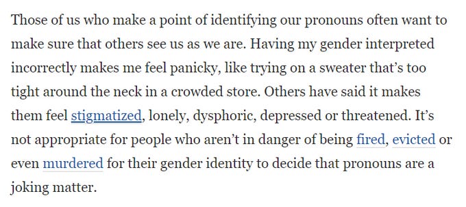 So, self-id isn't really about having the freedom to believe whatever you wish about yourself but about leveraging social, economic, and ultimately legal pressure to coerce other people into believing or pretending to believe in your idea about yourself.